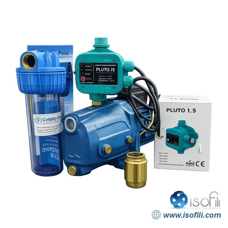 Kit per la regolazione della pressione dell'acqua domestica, dotato di elettropompa, presscontrol con manomentro, valvola di non ritorno e filtro anti calcare e impurità